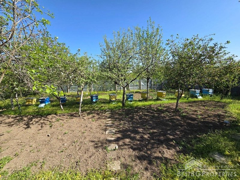 Во дворе много живых фруктовых деревьев, что создает приятную и плодородную среду, подходящую для пчеловодства. Помимо основного здания, есть гараж, мастерская и несколько дополнительных хозяйственных построек.
