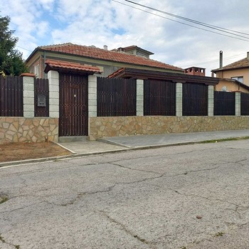 На участке есть гараж и парковочные места на две машины. Половина участка огорожена забором из бетонных блоков. Оставшийся забор - сетка. Водоснабжение на осуществляется гидрофором. Есть отдельный колодец и резервуар для дождевой воды площадью 28 кв. м для полива. Сад очень ухоженный, с виноградными лозами, фруктовыми деревьями, огородом, цветами.
