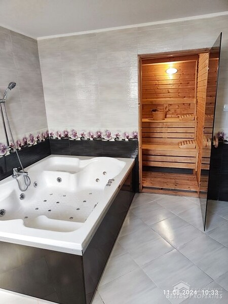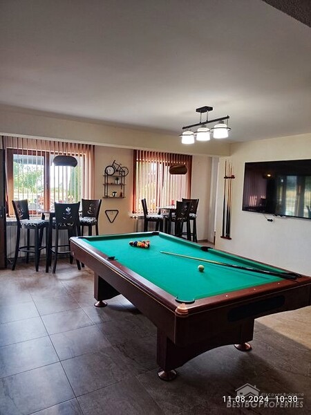 На первом этаже расположены веранда (барбекю), просторная гостиная, кухня, гостевая комната с бильярдным столом, спальня, огромная ванная комната с туалетом, сауной и джакузи.